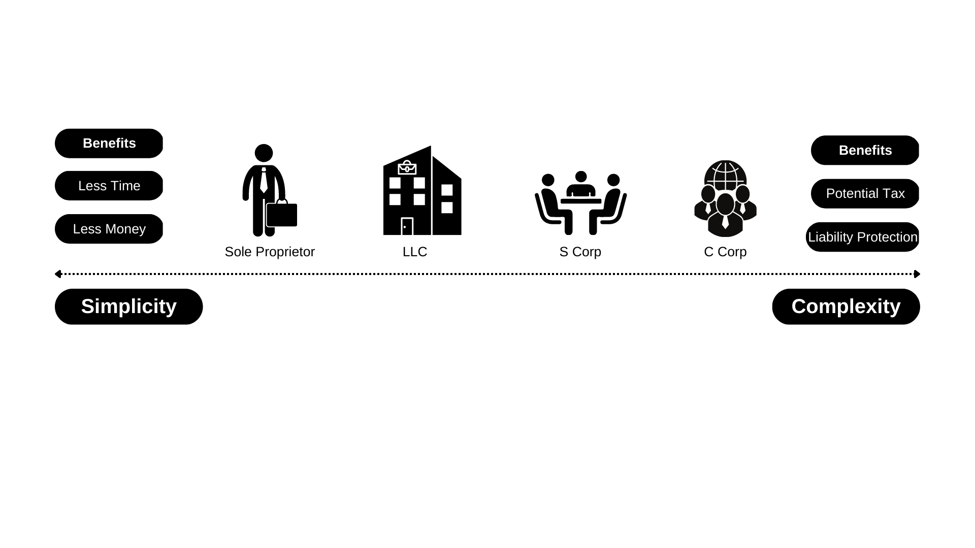 I’m sure you’ve heard of them before: LLC’s, Corporations, etc. They are a way of classifying your business with the state in the legal address you picked for your business. This allows you to choose along the Simplicity – Complexity scale where you want your business to lay.